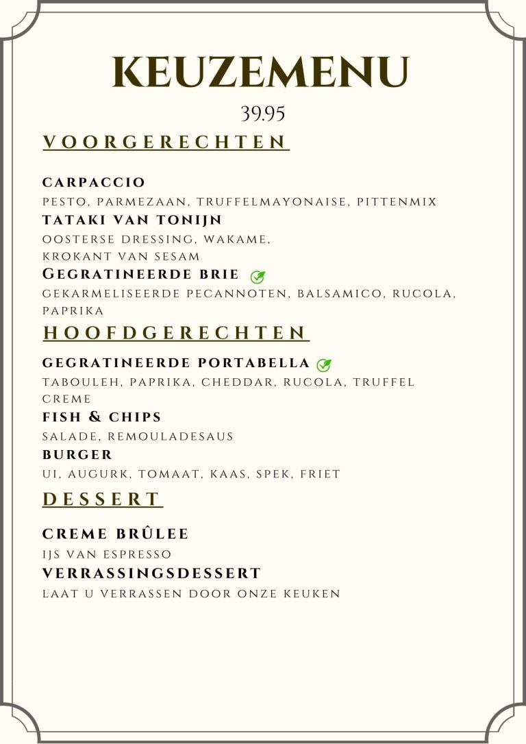 Wijn spijs menu Ons Wijn Spijs menu bestaat uit 3 gangen waarbij u iedere gang een tussengerecht krijgt. U kunt hierbij denken aan vis, vegetarisch en vlees gerechten. Bij elke gang wordt er een bijpassende wijn geserveerd. De gerechten zullen ook per seizoen wisselen. Mocht u vaker komen geef dit dan aan zodat we iets anders voor u kunnen verzinnen. Lust u een bepaald soort wijn niet of u drinkt juist maar één soort wijn dan houden wij daar graag rekening mee voor u. Reserveren kan via de site of even bellen naar 0481-374865. 3 gangen voor €43,50 p.p.