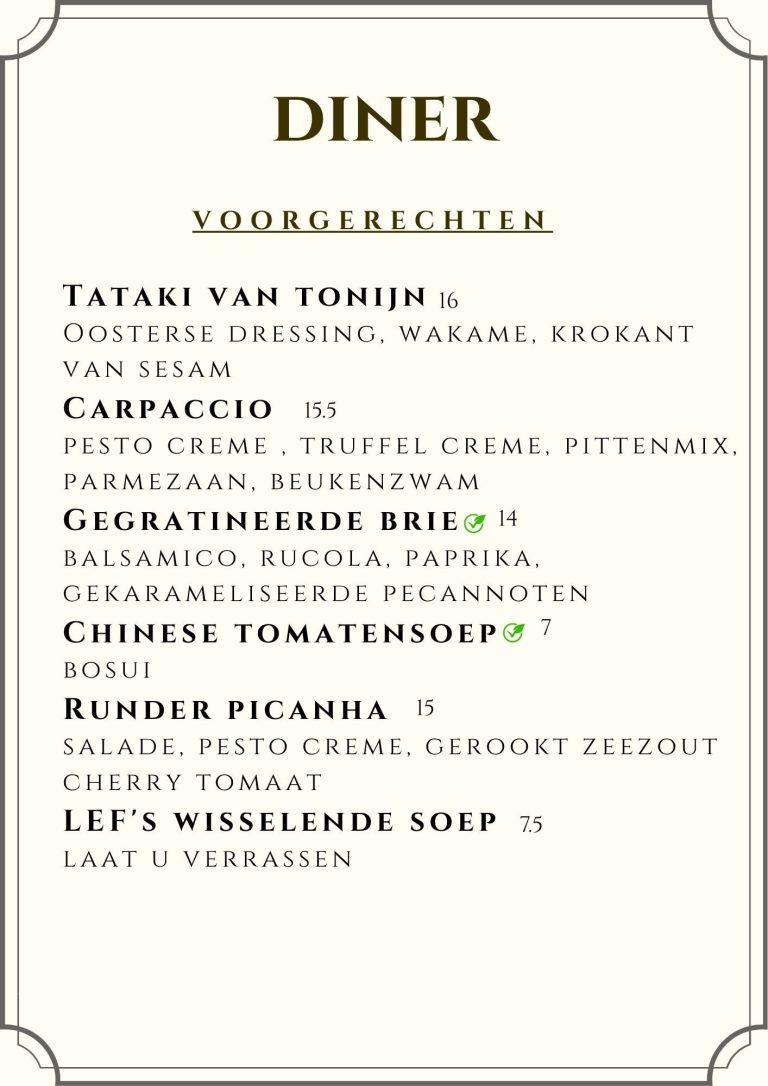 Bij Restaurant Lef draait het diner om meer dan alleen eten: het is een moment van beleving, smaak en verrassing. Of je nu kiest voor een verfijnd voorgerecht, een seizoensgebonden hoofdgerecht of een van onze huisgemaakte desserts – onze keuken werkt met passie, verse ingrediënten en een snufje lef.