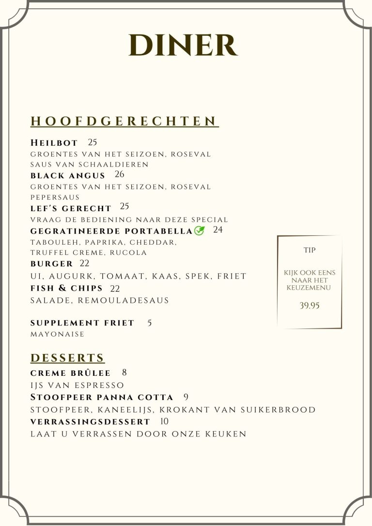 Laat je verrassen door Lef’s gerecht, stel je eigen diner samen, of kies voor het keuzemenu voor een complete culinaire avond.