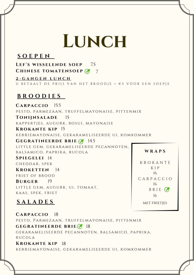 Bij Lef in Elst geniet je van een heerlijke lunch in een warme en eigentijdse sfeer. Onze lunchkaart biedt voor ieder wat wils – van verse soepen en rijk belegde broodjes tot smaakvolle salades en wraps. Alles wordt met liefde en lef bereid, met dagverse ingrediënten en een creatief tintje.